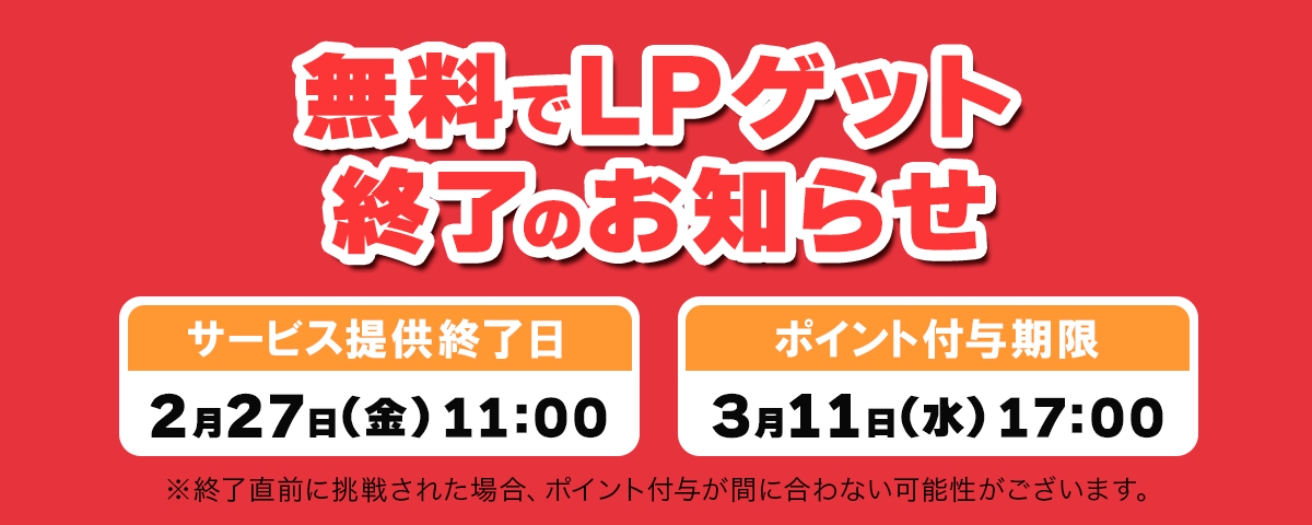 サービス終了直前に挑戦された場合、タイミングによってはLP付与が間に合わない可能性がございます。余裕を持ってご利用ください。